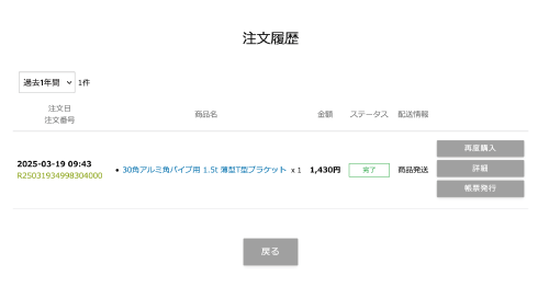②過去の注文の一覧が表示されるので、帳票を発行したい注文の「帳票発行」へアクセスします。